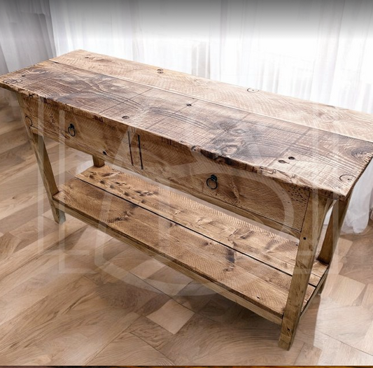 Découvrez l'authenticité et le design unique de mes consoles en bois, fabriquées à la main à partir de traverses de chemin de fer recyclées. Chaque pièce est une création artisanale unique, réalisée sur commande.